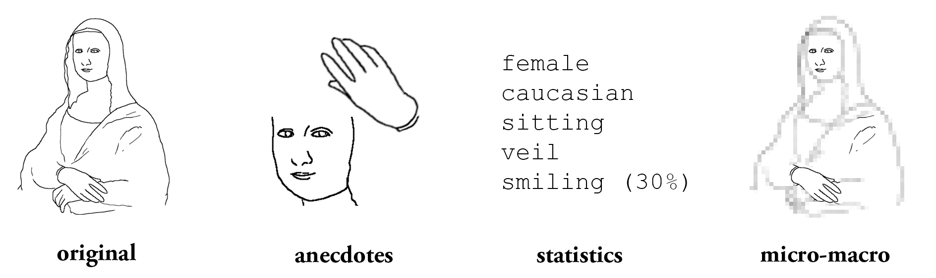 Ways to describe the world: cherry-picking anecdotes, abstract descriptions from statistics and getting an overarching picture with micro-macro.