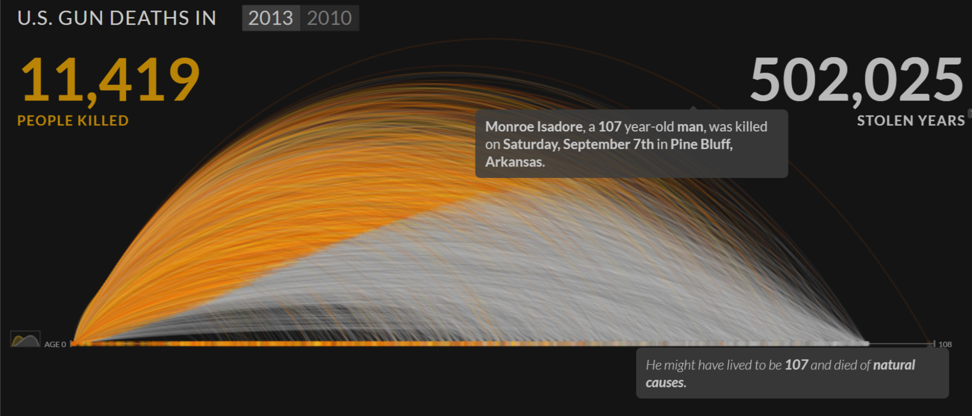 Gun Deaths is also interactive and it’s possible to hover over arcs to get name, age and place of death of the victim. With interactivity it becomes possible to learn about these cases and also the outliers, like the story of 107-year old Monroe Isadore, apparently the oldest victim in the data set. But thanks to the macro-level, nobody would pull him out as a representative example for all gun victims or declare gun wounds a new major health crisis for 100+ year olds.