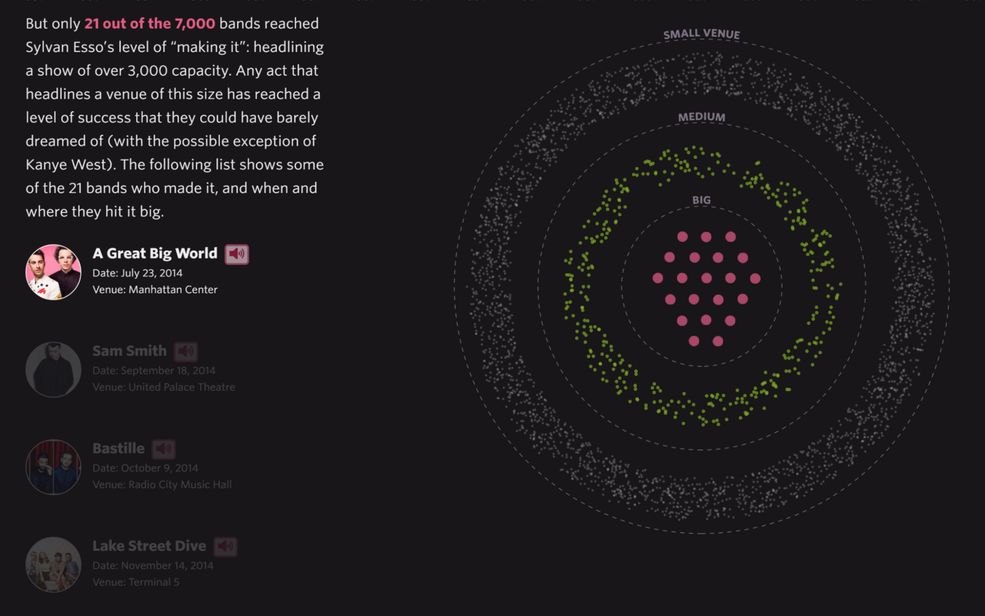 Making It Big clearly shows the sad reality of only 21 out of the 7000 bands in the data ever playing at bigger venues.