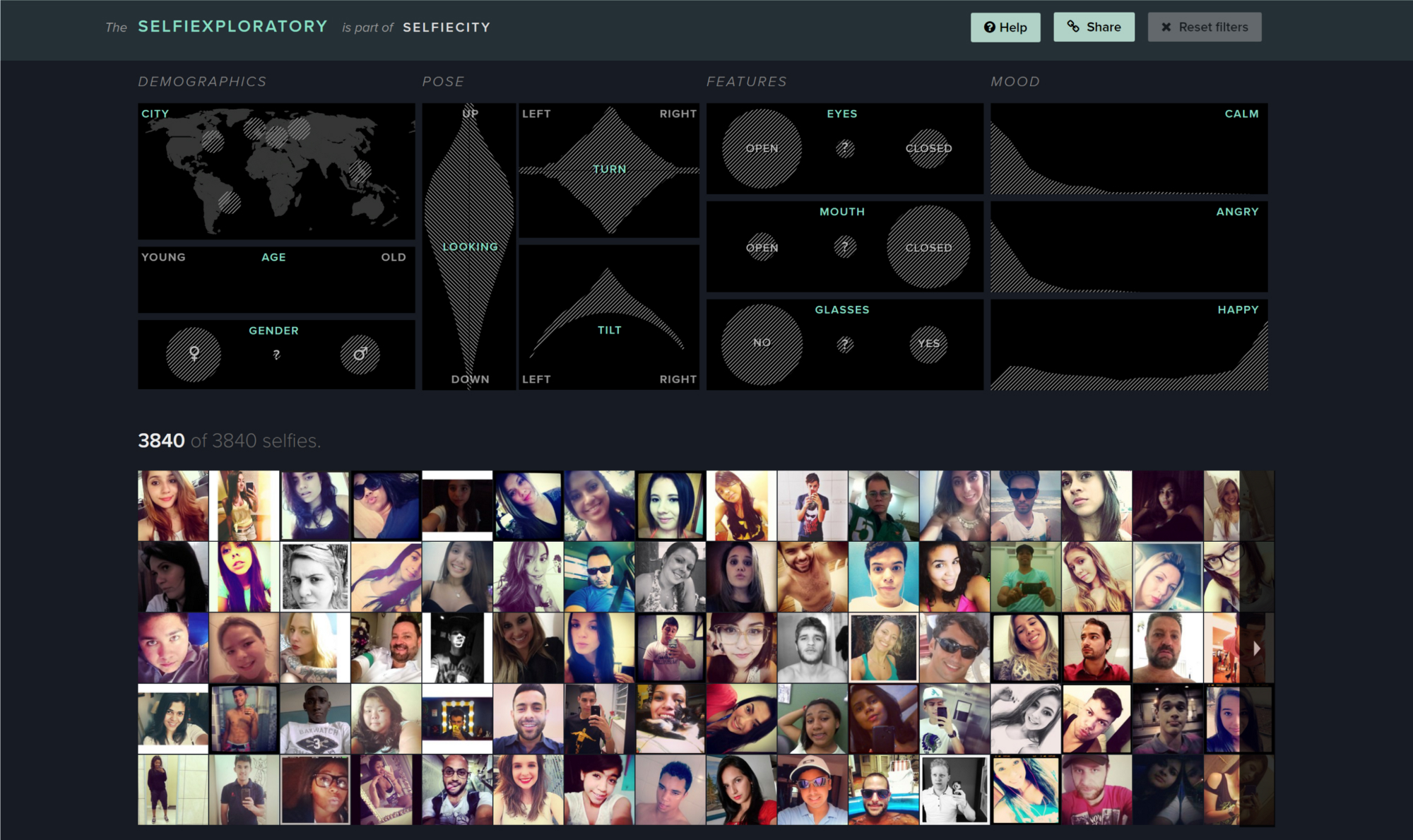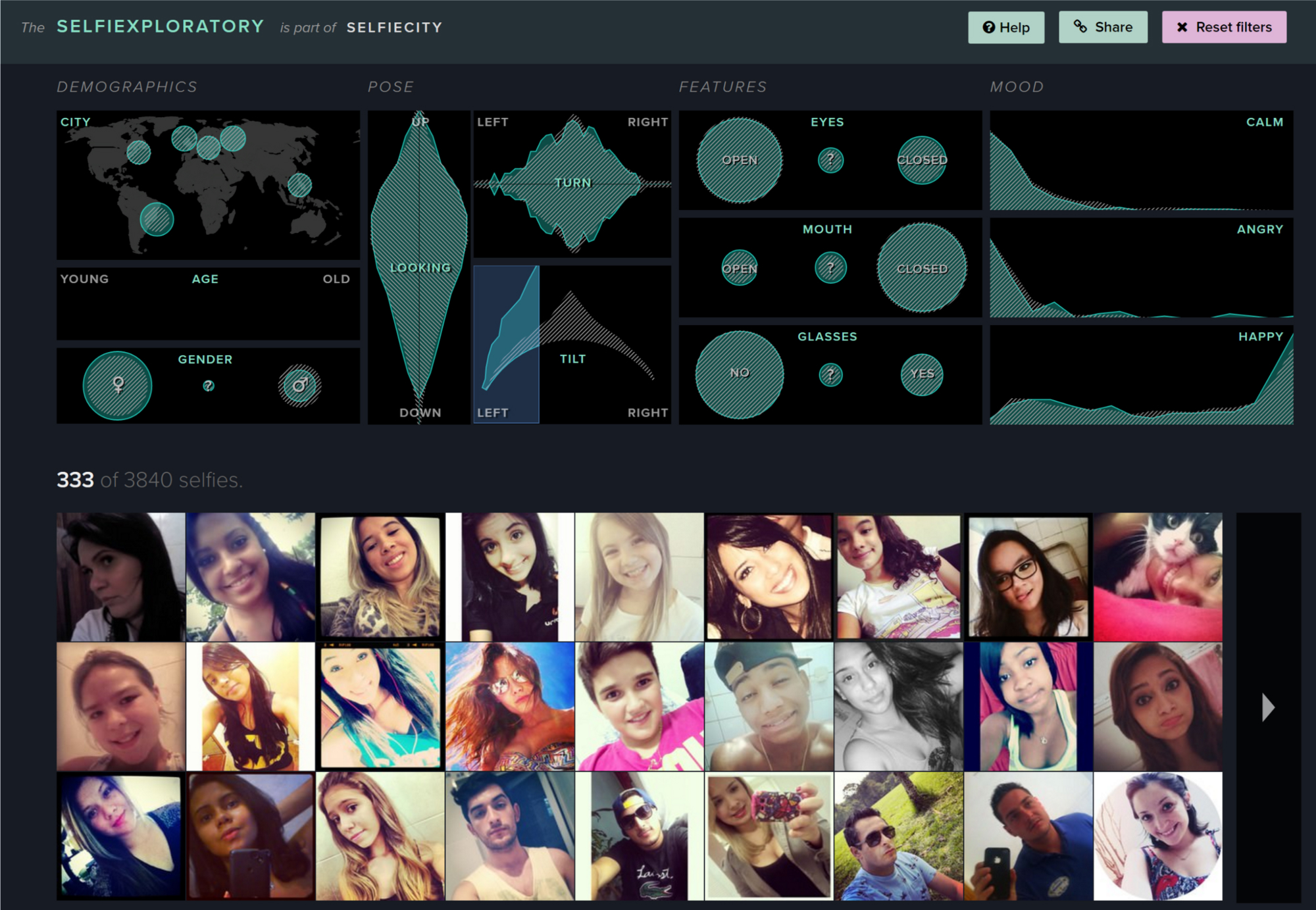There’s no aggregation or reduction in complexity— except for shrinking the image resolution, the selfies at the bottom of the Selfiexploratory are the same ones we’ve based the overall analysis on. It would be hard to enrich those anecdotes even more.