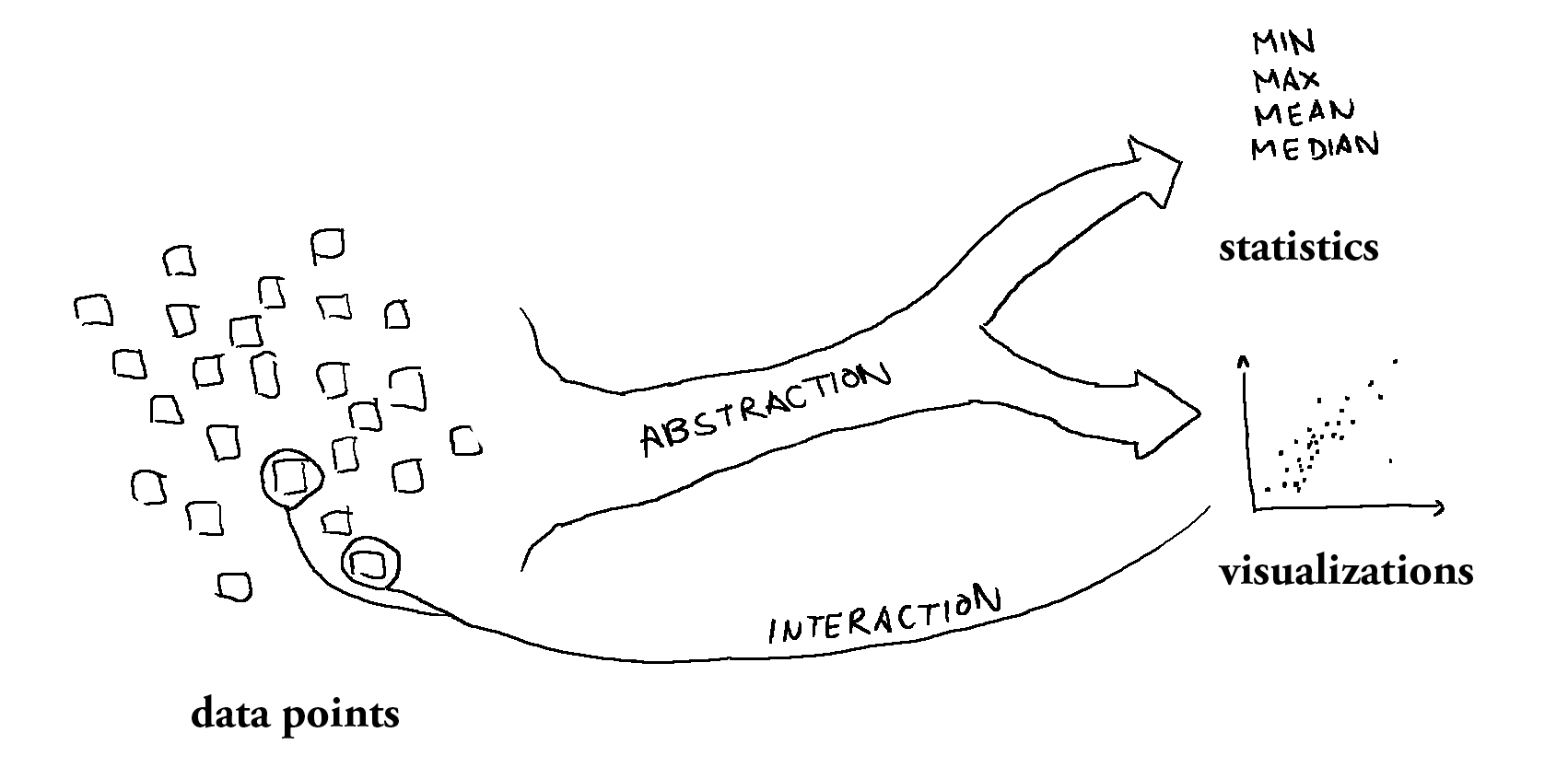 Data sets consist of data points. At some point, these points have been collected and aggregated. This abstraction step leads to broader but less detailed descriptions like statistics. With datavis, we’re no longer trapped on the macro-level — undoing the abstraction and uncovering the original data points in all their glorious micro-level nature.