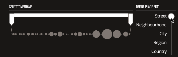 Visits automatically turns the data into a map-timeline and makes some assumptions about it: one important aspect is what defines a place. Since each place gets their own map, a sensible setting must take the type of location history into account. Working with two-weeks of vacation data? The hotel and the beach should probably count as distinct places. Working with a five-year lifelog? Having countries as places should lead to better results. The trade-off is always been creating too many and not enough map bubbles. Fortunately, visits lets you adjust that setting interactively - just drag the 'Place Size' slider at the bottom et voilà: