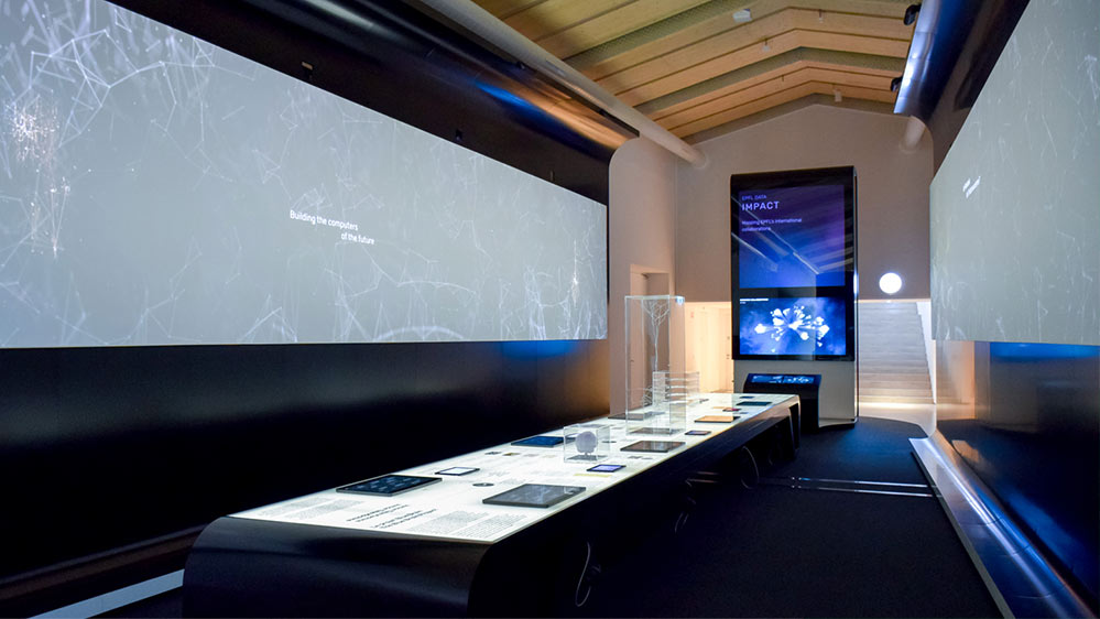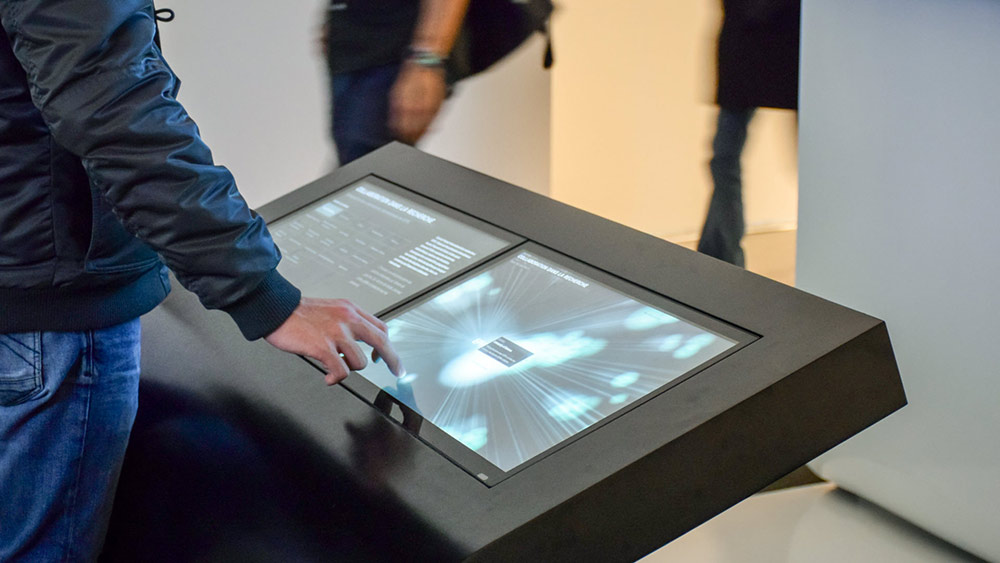 The installation itself is housed in an over 4 meters tall custom-built column, containing two 24" touchscreens, one large 4k display and a back projection. Standing in front of it, people can explore the data either on the touchscreens directly or by watching a high-resolution version of it on the large "wall"-display.