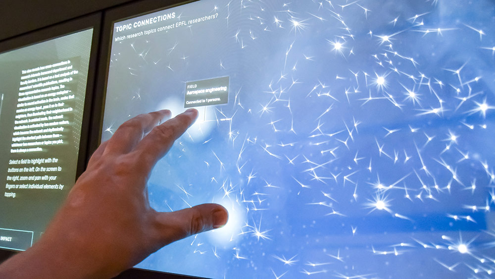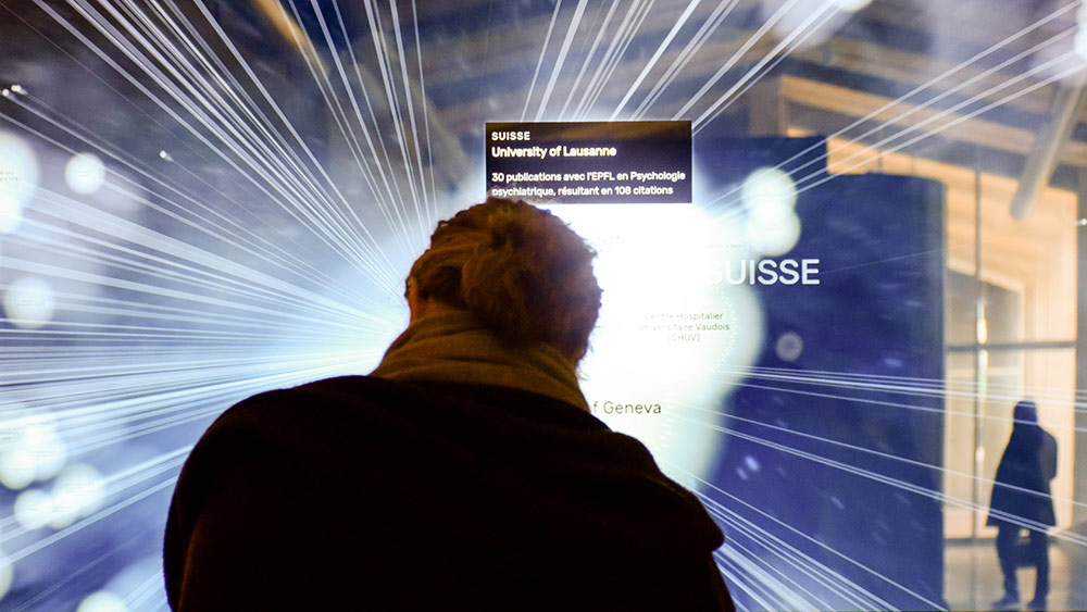 The EPFL Data Monolith presents the wealth of data the École Polytechnique Fédérale de Lausanne has collected about themselves. The staff and the students, the researchers and their topics and the impact the university has in world-wide collaborations becomes visible.