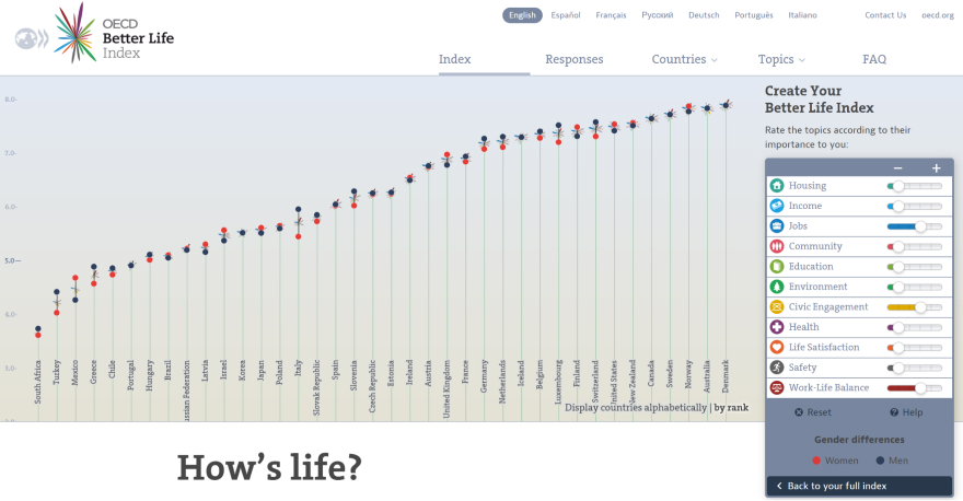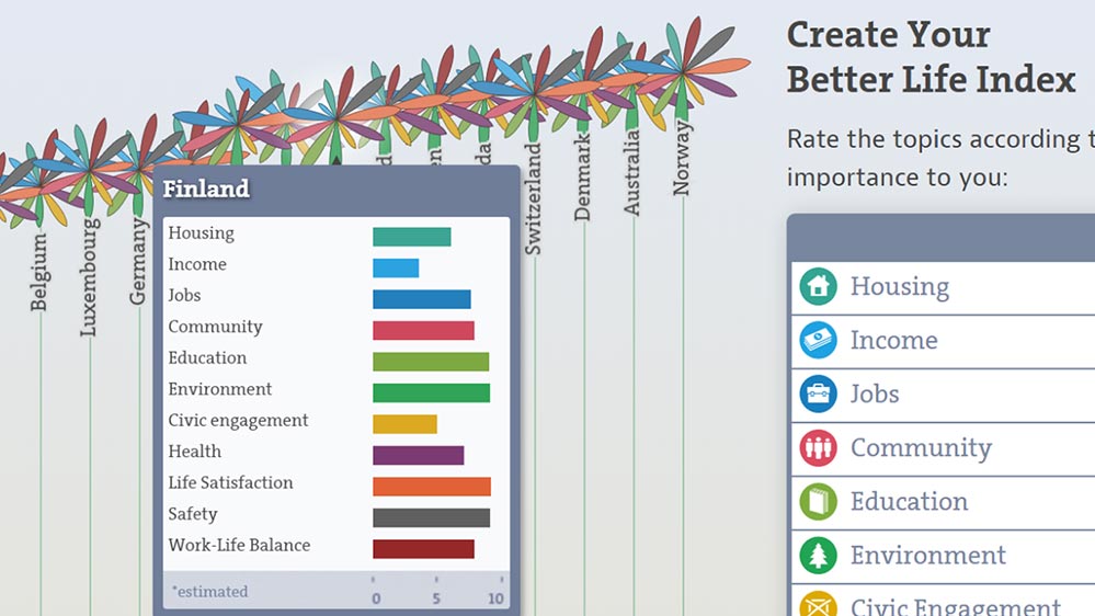 The OECD's Better Life Index project collects year after year well-being data from various countries around the world. Along 11 dimensions such as Housing, Community and Work-Life Balance, the report provides an in-depth look at people's living situations.