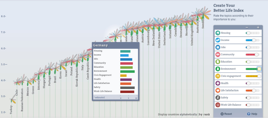 The visualization itself shows the various quality-of-life factors for all participating countries from the report. Interactive sorting and filtering lets the reader adjust the viz according to personal preferences to find their own perfect country.