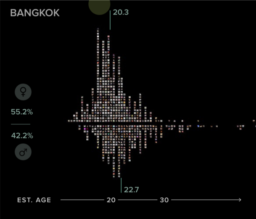 Selfiecity's analyses are available on the project's website. We've turned them into charts highlighting demographic aspects or facial features. The complete dataset is also available in the Selfiexploratory, an interactive selection tool for filtering and exploring the selfie collection and its attributes.