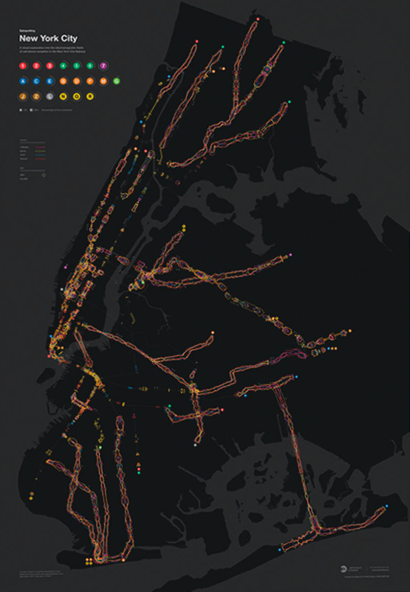 The Subspotting project captured the cell phone reception along the complete NYC subway network for the four main carriers. Using a custom-built measuring app, we traversed the whole 660 miles of track. The resulting unique dataset shows in detail how strong the signal will be at a given point on a given line.