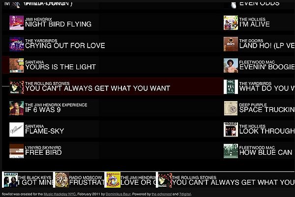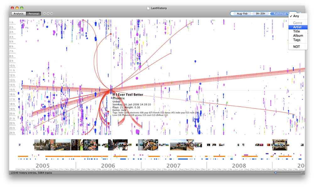 LastHistory (w: Frederik Seiffert) - a music listening history visualization highlighting both long-term as well as daily patterns. It enabled playback of songs (listening to the songs of a previous summer vacation, for example), while also showing photos from that time - a reminiscing machine.
