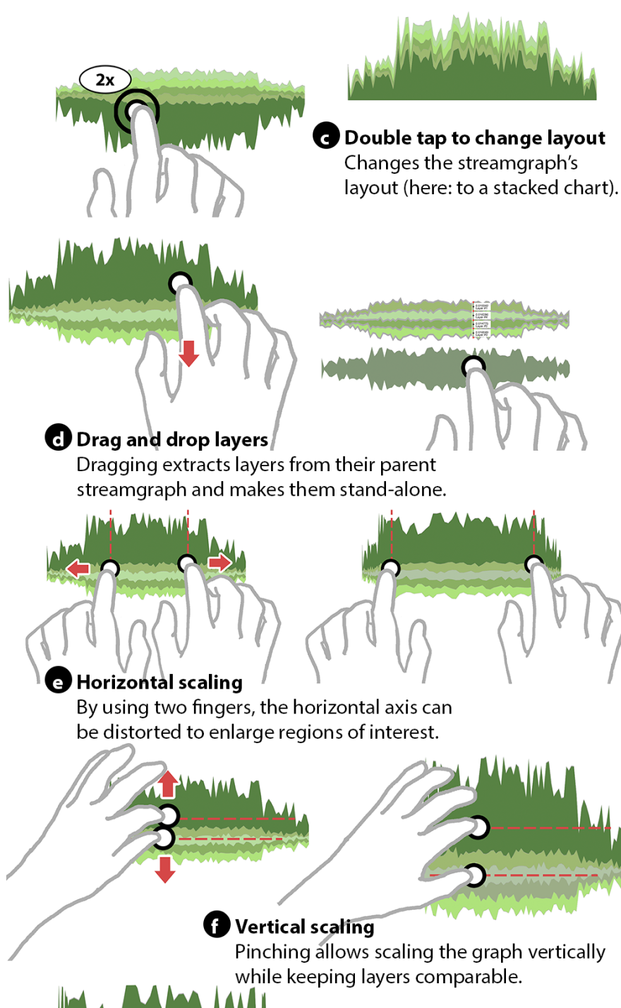 Streamgraphs suffer from readability issues for single curves or comparisons between them and scalability issues when working with many layers (making it hard to select a specific one). For TouchWave, we came up with various interactions that counter these problems.